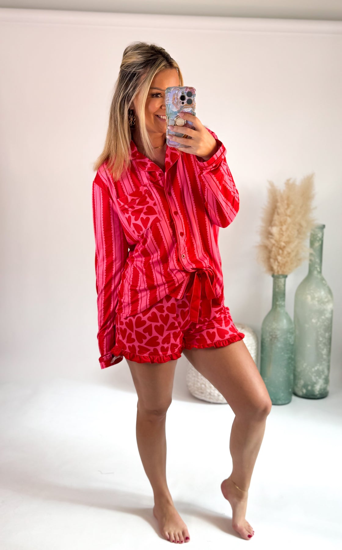 Show off your love this Valentine’s Day with the Heartfelt Stripes Ruffle Pajama Set. Featuring a long-sleeve top with red stripes and a playful heart pocket, it pairs perfectly with matching shorts decorated with a heart pattern, red ruffles, and a charming bow. Ideal for Valentine’s, Galentine’s, or whenever you want to be the sweetest in the room—even if that’s just your cozy living space. Model is wearing size medium.