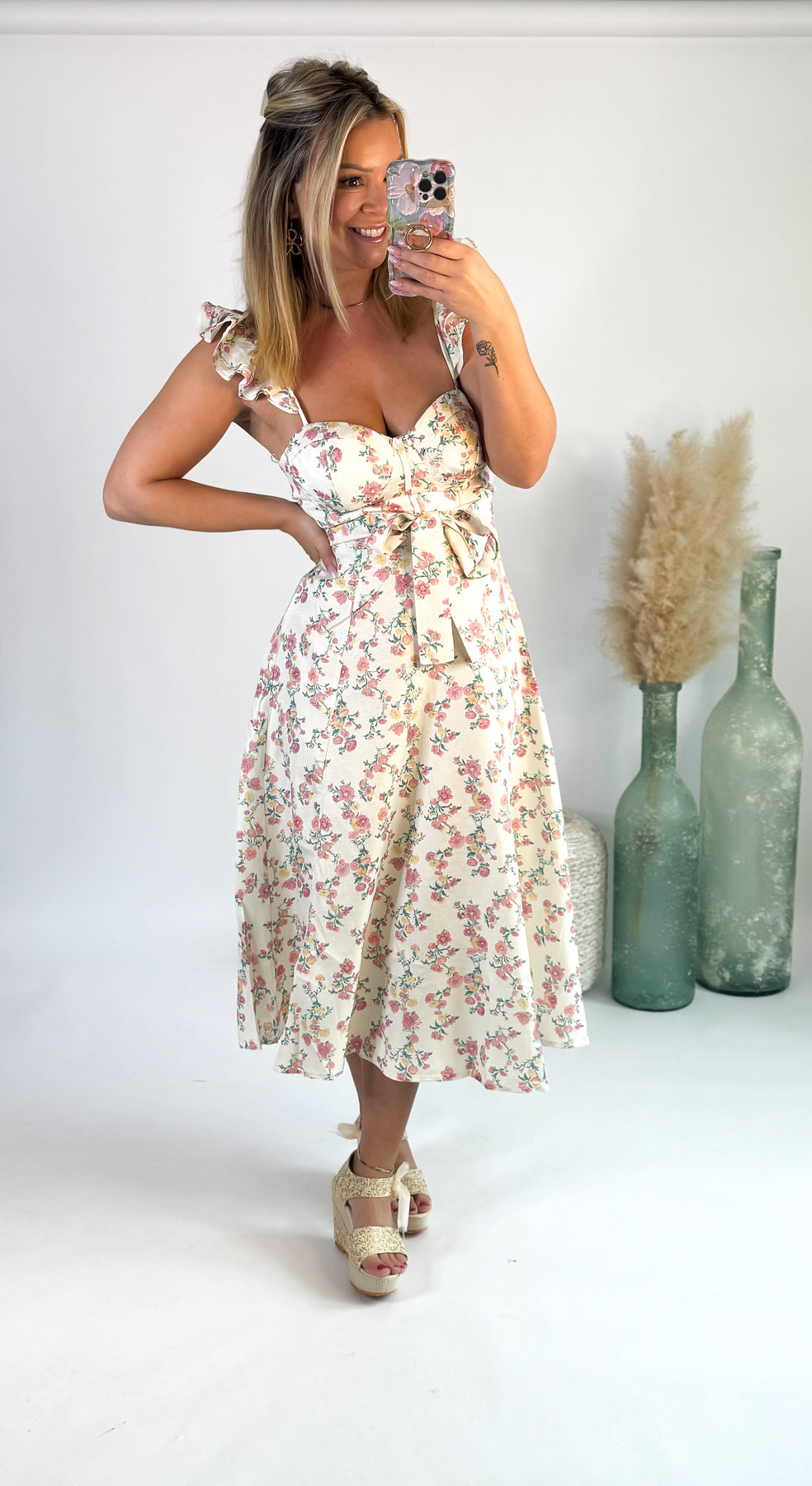 Soft, romantic, and effortlessly flattering — The Sweetest Promise Midi Dress is made for twirling through spring days and golden-hour evenings. Designed with a feminine floral print on a creamy base, this midi features ruffled shoulder straps, a structured sweetheart neckline, and a statement bow tie at the waist that cinches you in just right. The flowy skirt is finished with a subtle front slit for easy movement and a touch of charm.