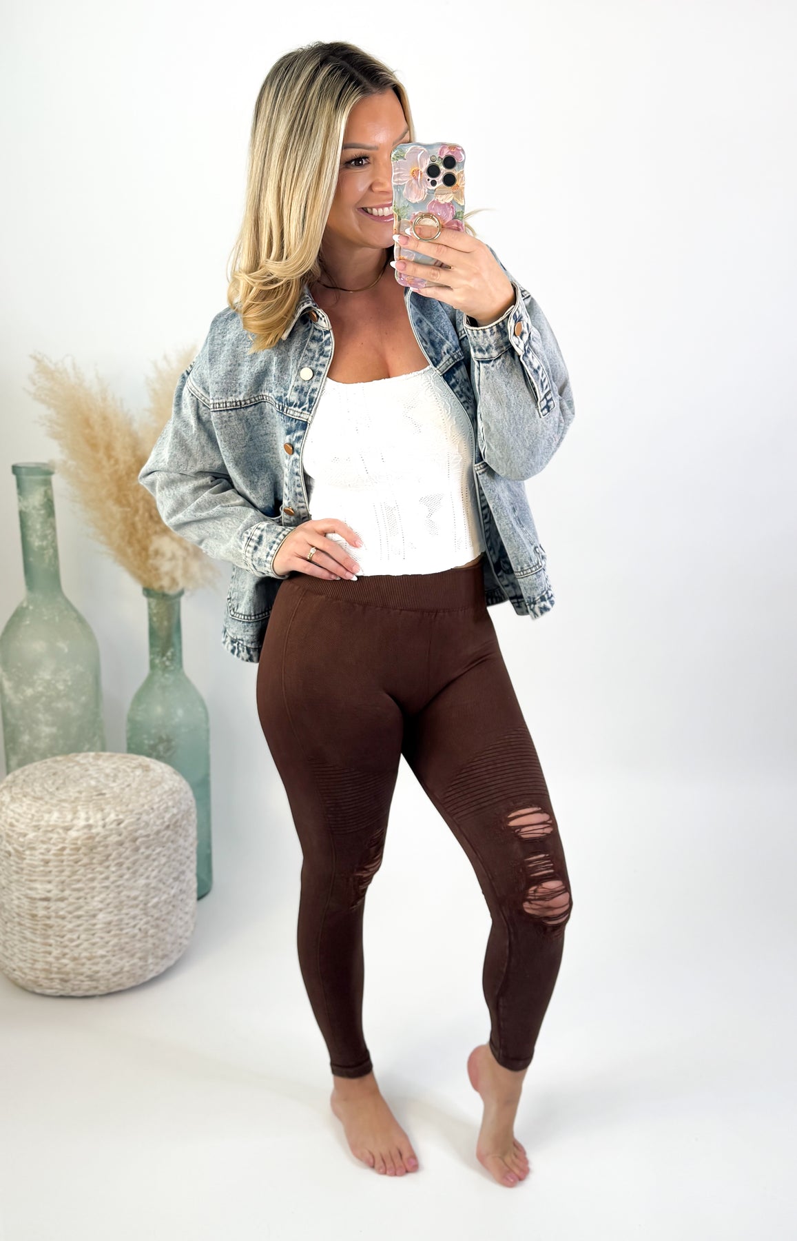 Premium seamless jeggings with a trendy distressed style at the knees. These jeggings