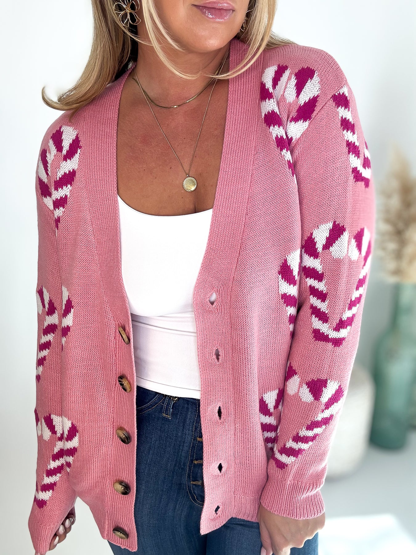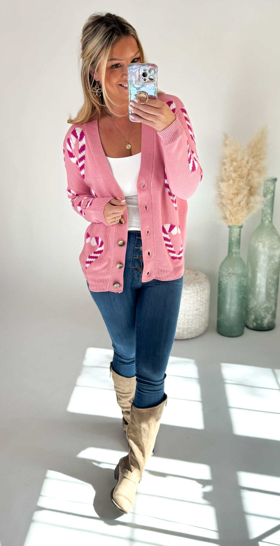 Sweet, festive, and guaranteed to brighten your whole holiday wardrobe! This bubblegum-pink cardigan is sprinkled with bold magenta + white candy cane graphics that give it that playful Christmas charm without being over the top. The chunky tortoise buttons, relaxed fit, and soft knit make it the perfect throw-on layer for all things merry — school parties, cookie baking, girls’ nights, or cozy gift-wrapping marathons. Fits true, model is wearing size medium.