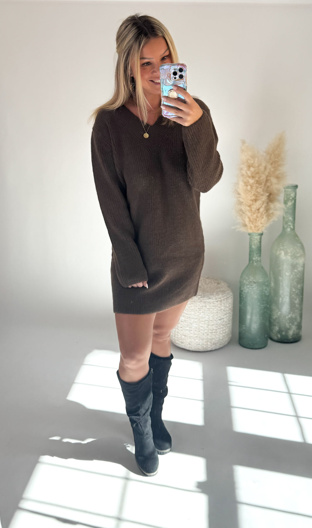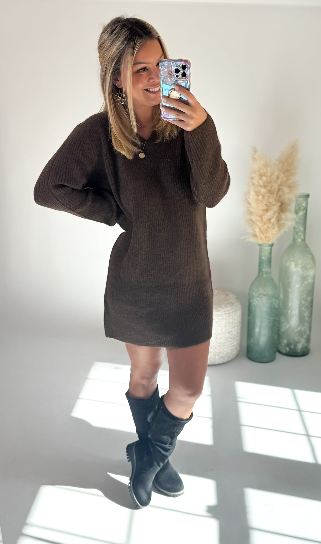 Say hello to your new holiday go-to — the Chocolate Brown Cozy Sweater Dress. This rich brown knit is soft, warm, and effortlessly flattering. With a relaxed silhouette and comfy stretch, it’s the perfect blend of cozy and chic. The subtle V-neckline gives it a touch of femininity while still keeping things comfortable and easy to wear.