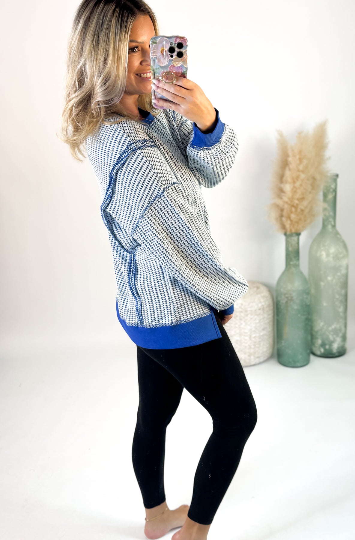 Say hello to your new everyday favorite! The Coastal Comfort Waffle Knit Top blends laid-back style with the softest, snuggliest texture. The two-tone blue waffle knit gives it that effortless, beachy vibe, while the contrast seams and solid blue cuffs/hem add the perfect pop.