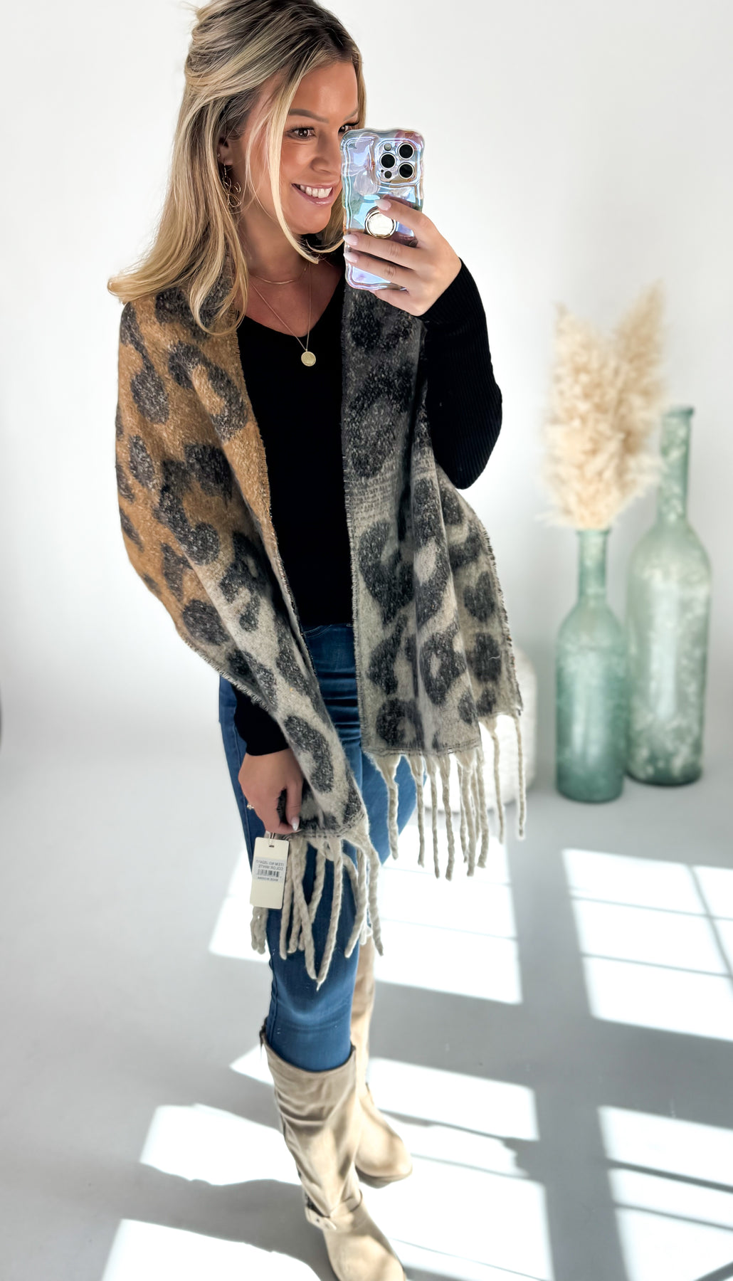 Leopard Print Oblong Scarf Shawl with Fringe -Multi-Color Leopard Pattern -Tassel at the ends -Oversized -Chunky Winter Scarf -100% Acrylic *One size ( Approx .100" L x 18 W )*
