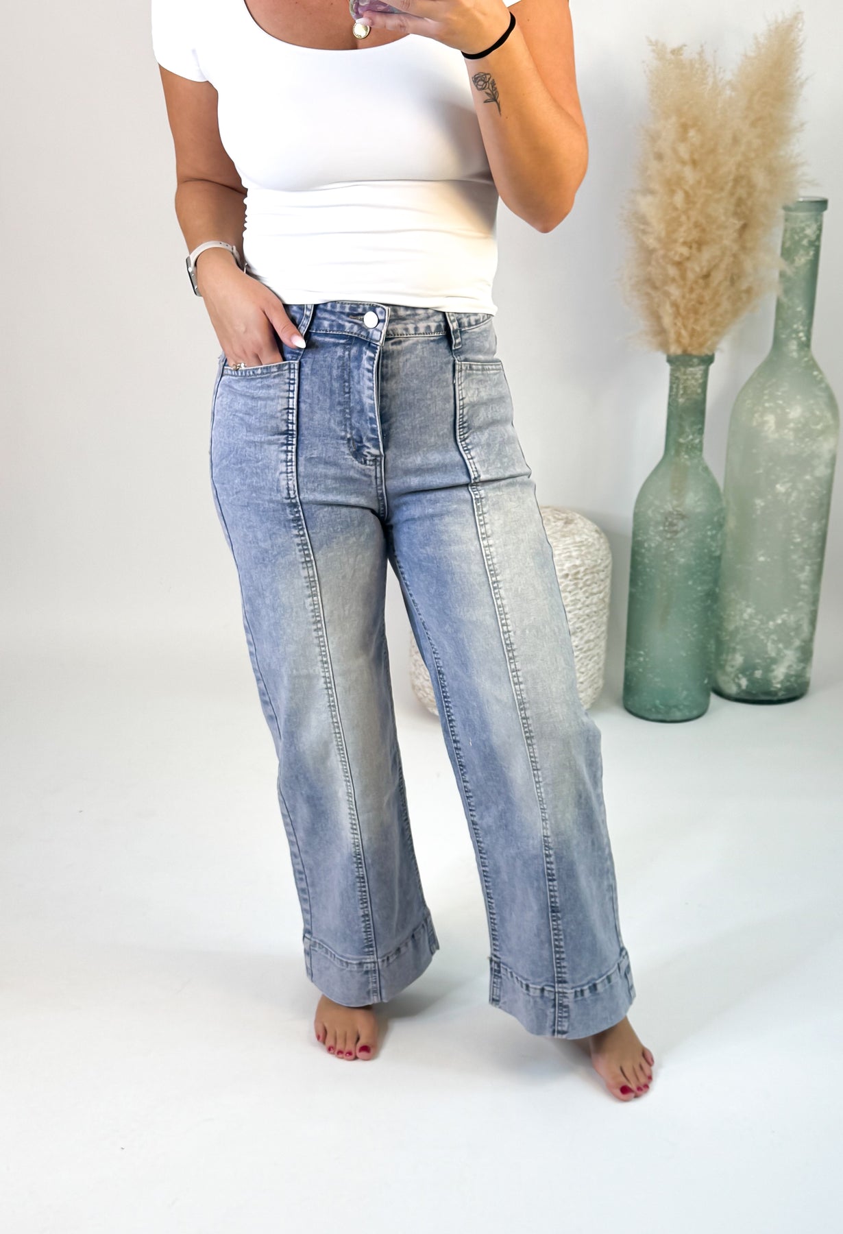 Say hello to your new favorite statement denim — the Skyline Seam Wide Leg Jeans. These light-wash beauties feature a structured front seam that elongates the legs, a flattering high-rise waist, and a relaxed wide-leg silhouette that gives you that effortless, model-off-duty vibe.