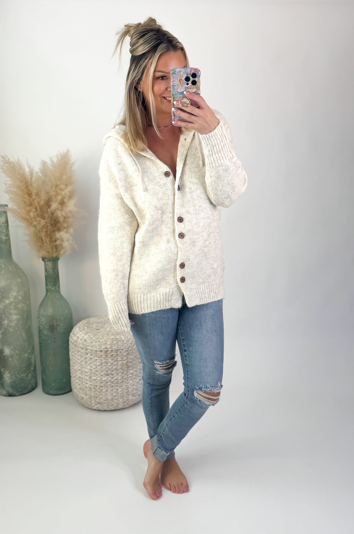 Meet the cardigan you’ll reach for over and over 🤍 The Soft Seasons Hooded Cardigan features a cozy neutral knit with a flattering relaxed fit, functional button front, and an easy hood for that laid-back, comfy vibe. The soft textured fabric feels warm without being bulky, making it perfect for layering through every season. Style it buttoned up with denim or wear it open over a tank or tee for effortless everyday wear.