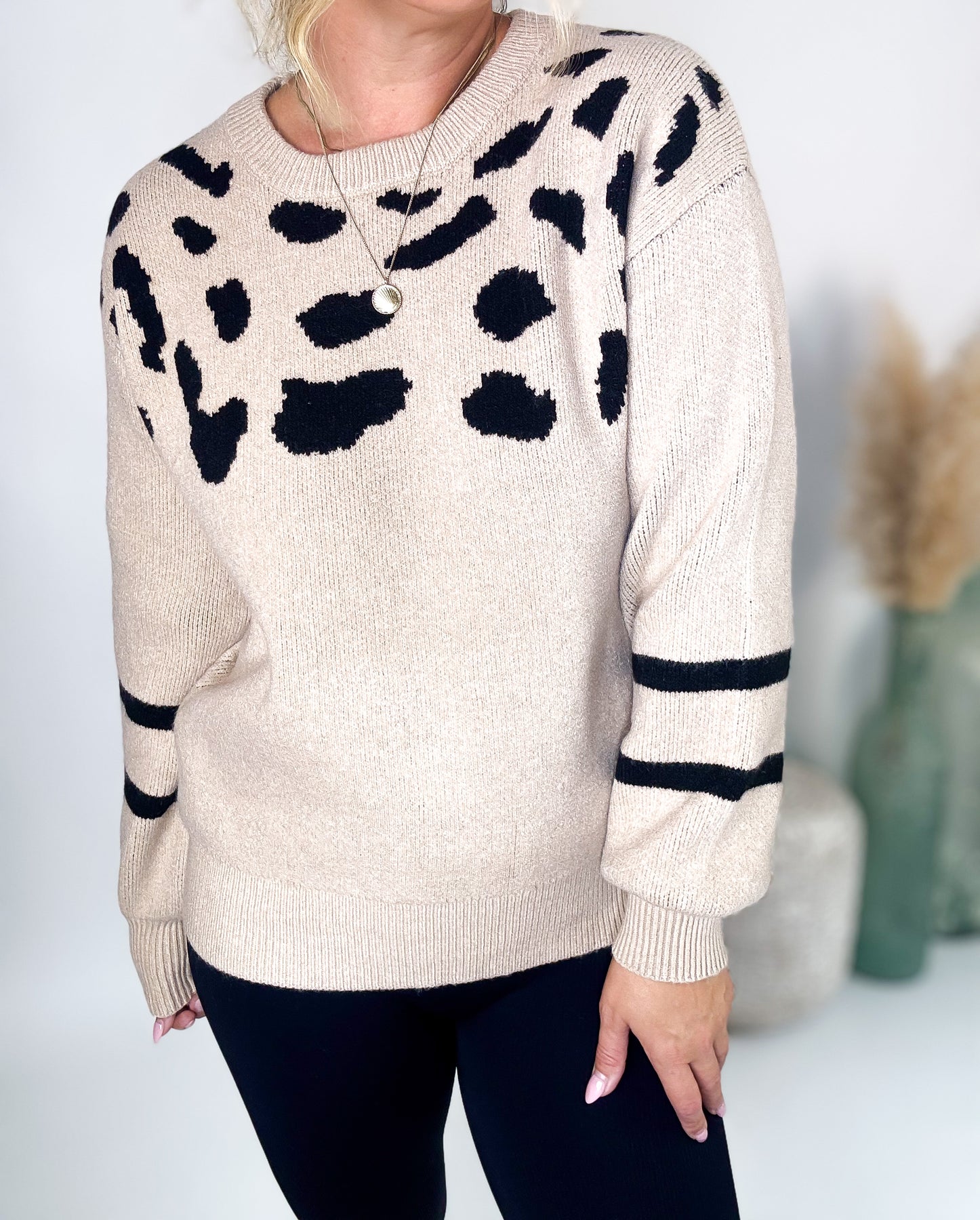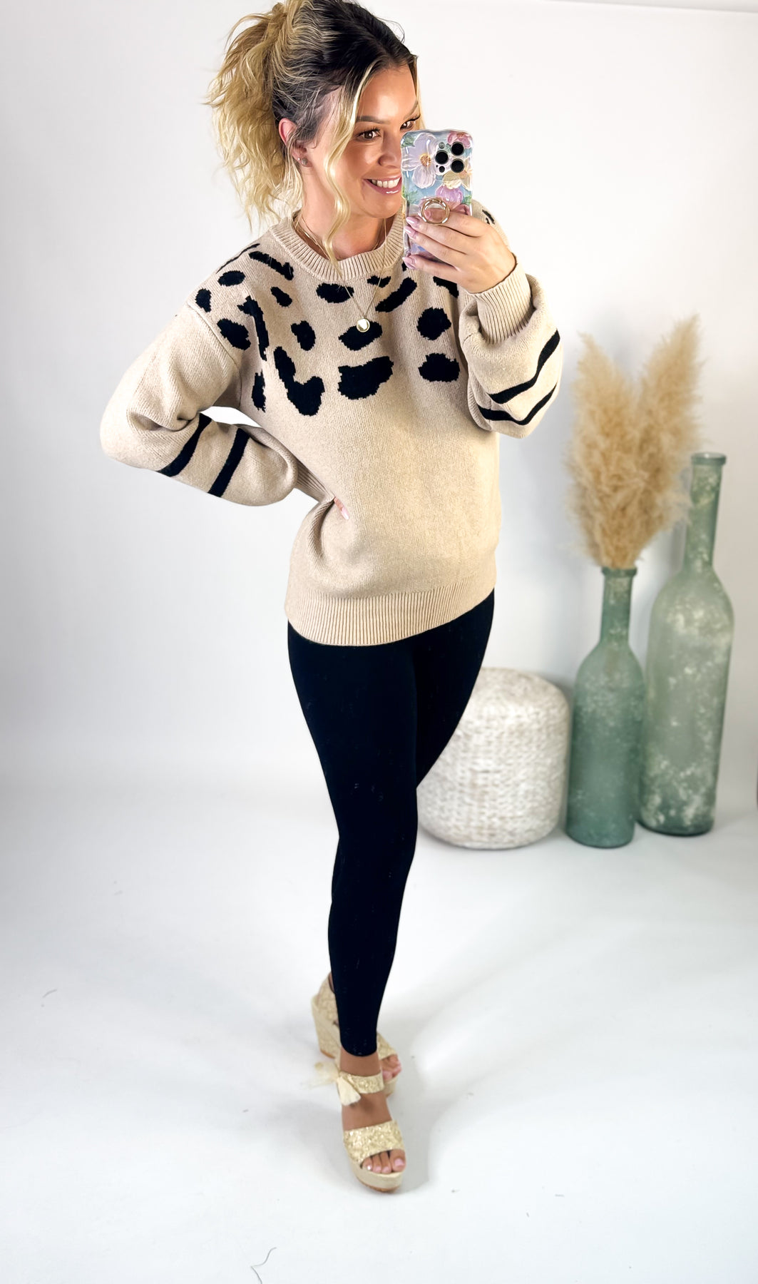 Add a pop of fierce to your fall wardrobe with our Wild Streak Sweater! This cozy knit features a bold black leopard pattern across the shoulders and sleeves, perfectly balanced by a soft beige base. The relaxed fit and ribbed trim make it effortlessly comfy while keeping that elevated, trendy vibe.