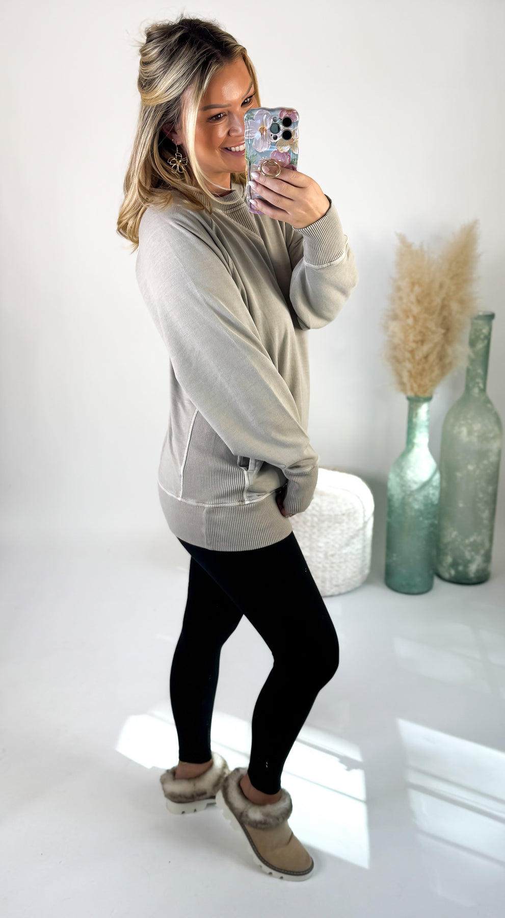 It features a classic crew neckline, ribbed cuffs and hem, and subtle stitching details that elevate it from your basic pullover. The hidden side pockets add the perfect touch of cozy (and convenient!).